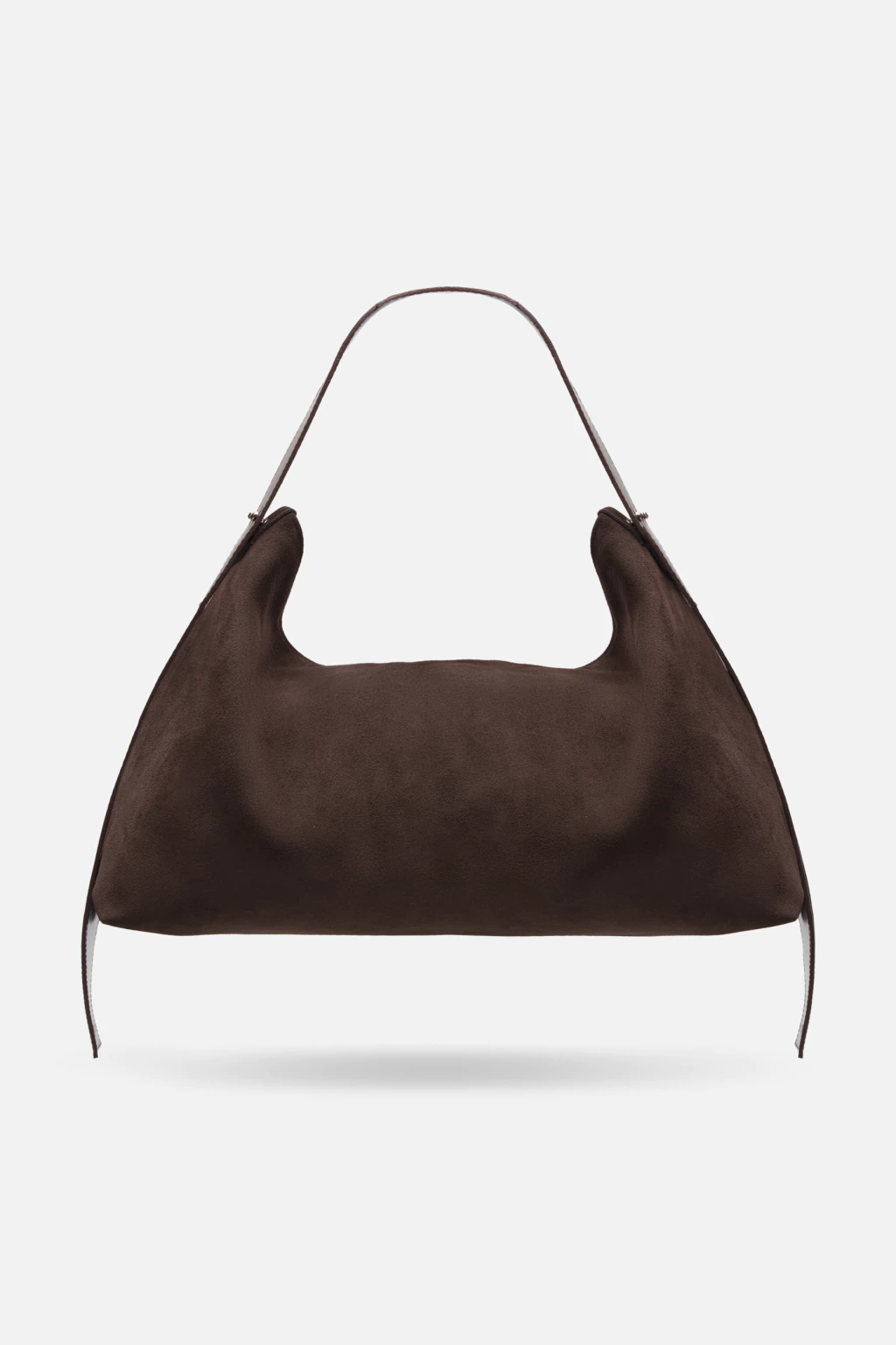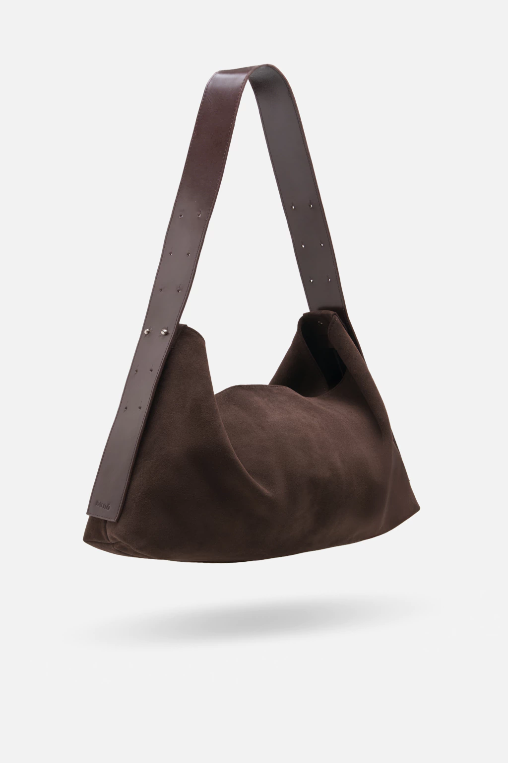 Está hecha en cuero vacuno, su cuerpo en gamuza chocolate y su manija en cuero tipo napa también chocolate.